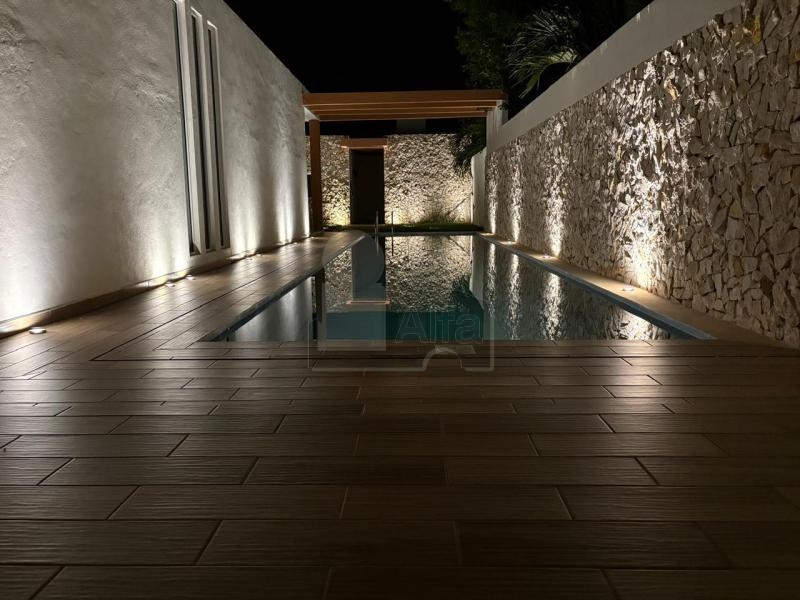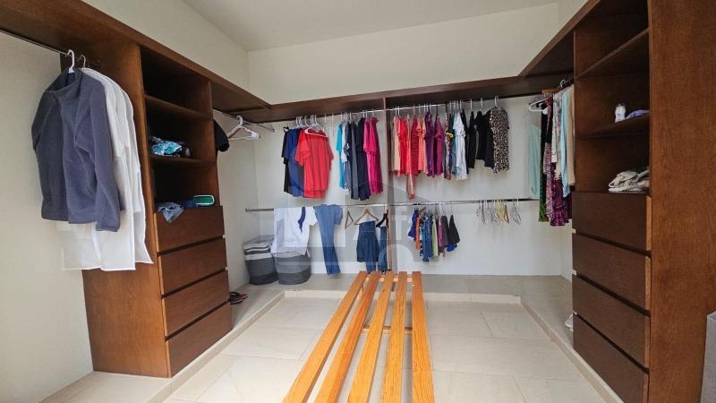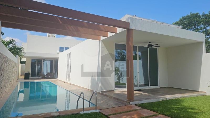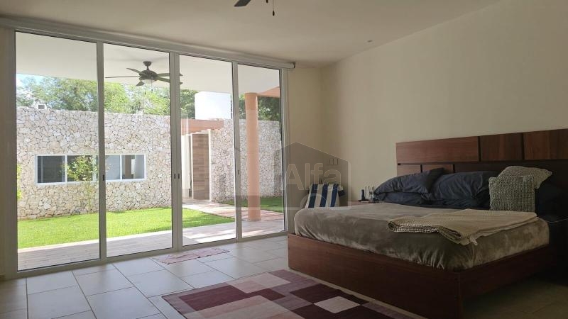 Casa en venta en privada Hacienda Cholul, Mérida, Yucatán. Sala comedor corridos a doble altura con vista al jardín y piscina, cocina amplia estilo americana con meseta de granito, barra desayunadora, campana, estufa de gas, alacena de muy buen tamaño, baño de visitas, terraza familiar techada amplia y con bar; estudio para TV o de cómputo, recámara principal muy amplia con un total de 29 m2 (5.65 x 5.20) con cortina motorizada, closet vestidor bien iluminado con luz natural, baño espacioso con doble lavabo; estudio muy amplio con baño con posibilidad de ser utilizado como recamara adicional, piscina de 14 metros de largo por 4 de ancho, estacionamiento techado para dos autos. PLANTA ALTA: habitación con closet vestidor, baño amplio y aire acondicionado, área de servicio con baño incluyendo tendedero. INSTALACIONES: piscina con filtros y luces de colores, acabado chukúm, cuarto de máquinas, bodega, instalación para lavadora y secadora, tendedero, suavizador de agua, sistema de ósmosis inversa, cisterna, 2 tinacos, respiraderos con mosquiteros, 12 páneles solares, 5 ventiladores, vidrios anti reflejantes, presurizador de agua, sistema de riego, biodigestor, jardines con sistema automático de riego. Puertas de madera en cuartos, baños y alacena.